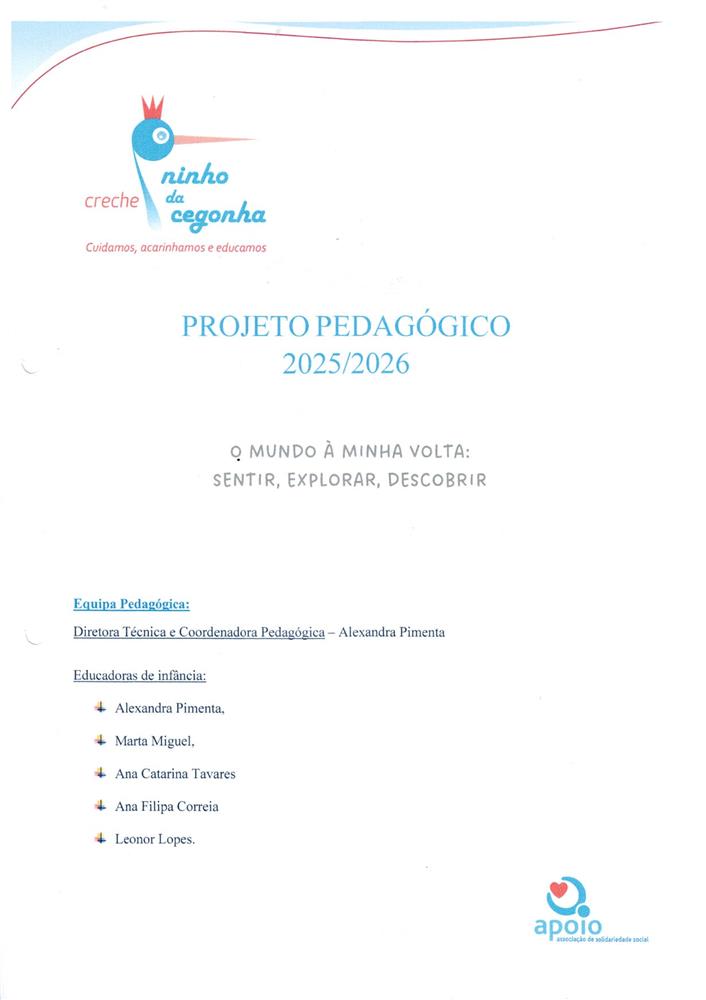 O Projeto Pedagógico da Creche Ninho da Cegonha, reflete toda a intencionalidade pedagógica da equipa técnica, tendo em conta as caraterísticas do grupo de crianças que frequentam a creche, como base os nossos valores e contexto educativo. Cada Projeto Pedagógico (anual) contém ainda o Plano Anual de atividades, e este por sua vez espelha a dinâmica da creche, é um conjunto de atividades onde está discriminada a calendarização das principais atividades pensadas em conjunto para cada ano letivo.