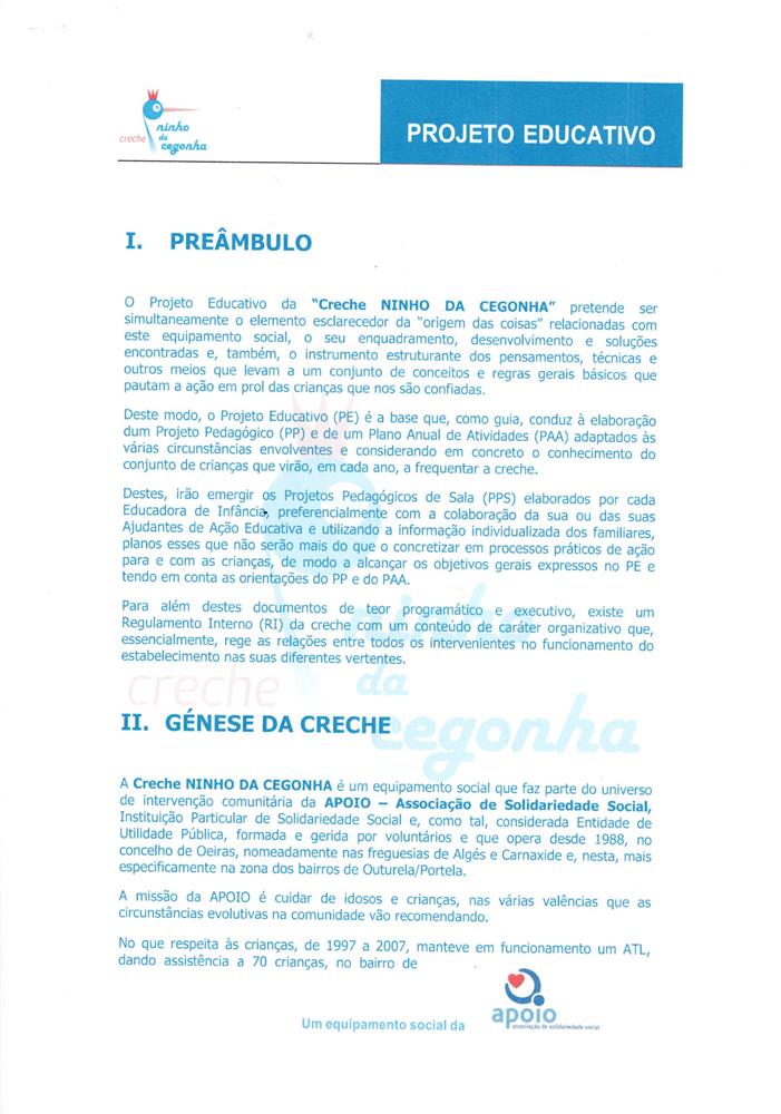 O Projeto Educativo da Creche Ninho da Cegonha é um documento que para além de explicar as “nossas origens”, orienta e estrutura pensamentos, técnicas e outros meios que levam a um conjunto de conceitos e regras gerais que são postos em prática com as crianças. Desta forma o Projeto Educativo serve de base e conduz á elaboração do Projeto Pedagógico e ao Plano Anual de Atividades que orientam ainda para a elaboração dos Projetos de Salas.